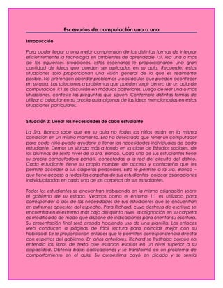 La situación 3 describe cómo la Sra. Blanco utiliza computadoras portátiles uno a uno para satisfacer las necesidades individuales de sus estudiantes. Asigna tareas personalizadas a cada estudiante en su carpeta digital de acuerdo a su nivel de habilidad. Esto ayuda a que estudiantes con diferentes habilidades como Richard y Emilia se involucren activamente y experimenten el éxito en el aula.