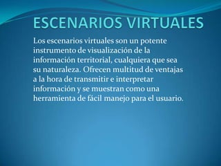 Los escenarios virtuales ofrecen múltiples ventajas para transmitir e interpretar información de manera fácil. Los escenarios educativos virtuales priorizan el aprendizaje más allá de las instituciones formales a través del uso de nuevas tecnologías. Los espacios educativos virtuales permiten el aprendizaje en cualquier lugar y momento a través de redes electrónicas que conectan nodos de interacción distribuidos.