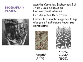 El documento proporciona una biografía de Maurits Cornelius Escher, centrando en su legado artístico, que incluye obras emblemáticas como 'Depth', 'Three Worlds' y 'Print Gallery'. Se explora su experimentación con la perspectiva en 3D, el uso de fractales y teselados en sus trabajos, así como la técnica de los calidociclos. Finalmente, se incluye una práctica sencilla para recrear una obra inspirada en Escher.