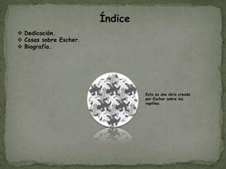 Este documento presenta información sobre el artista M.C. Escher y su trabajo. Brevemente describe su biografía, incluyendo que nació en Países Bajos en 1898, era conocido por sus grabados de figuras imposibles y mundos imaginarios, y murió en 1972 a la edad de 74 años. También proporciona detalles sobre su educación artística y sus viajes a España e Italia para inspirarse. El documento está dedicado a los estudiantes de 1oAC y su profesor de matemáticas Carlos.