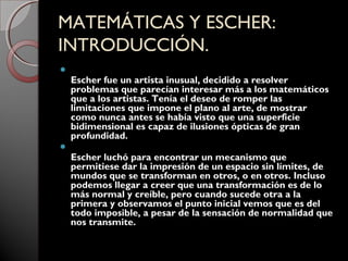 Escher era un artista que se inspiró en las matemáticas para crear ilusiones ópticas en sus obras bidimensionales. Exploró conceptos como reflexiones, simetrías, particiones del plano y el infinito para generar mundos imposibles que desafían la lógica. Aunque no tenía conocimientos formales de matemáticas, dominó técnicas como particiones periódicas y metamorfosis de figuras que le permitieron llenar superficies de motivos transformándose. Sus ilusiones forzaron a los espectadores a mirar sus ob