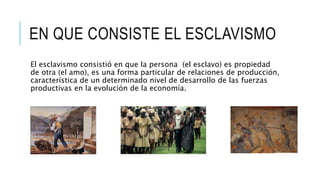 El esclavismo es una forma de relación de producción donde el esclavo es propiedad del amo, común en la antigüedad greco-romana. A lo largo de la historia, han existido movimientos proesclavistas y también abolicionistas que surgieron a partir de las ideas de la Ilustración y la Revolución Industrial. En la actualidad, persiste la esclavitud en algunas regiones del mundo donde la corrupción y la falta de regulación permiten su continuación.