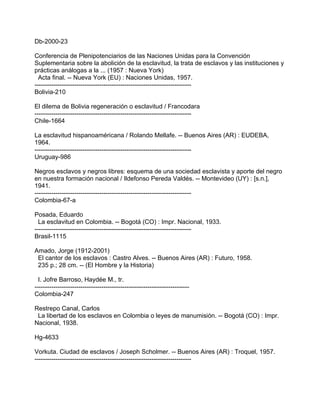 Este documento contiene una bibliografía sobre el tema de la esclavitud con 22 referencias bibliográficas de diversos países como México, Venezuela, España, Argentina, República Dominicana, El Salvador, Estados Unidos, Bolivia, Chile, Uruguay, Colombia y Brasil. Las referencias cubren aspectos como la esclavitud prehispánica, la esclavitud africana en América Latina, la abolición de la esclavitud en diferentes países y regiones, y estudios históricos sobre la esclavitud y población esclava en