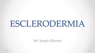 La esclerodermia es una enfermedad crónica que causa engrosamiento de la piel. Puede ser localizada o sistémica. La esclerodermia sistémica afecta músculos y órganos internos. El síndrome CREST es una forma de esclerodermia sistémica que se caracteriza por calcinosis, fenómeno de Raynaud, trastornos esofágicos, esclerodactilia y telangiectasias. El tratamiento incluye evitar factores de riesgo y medicamentos como prednisona, D-penicilam