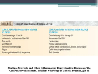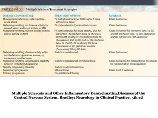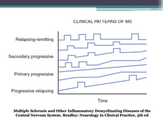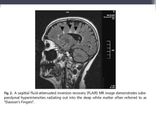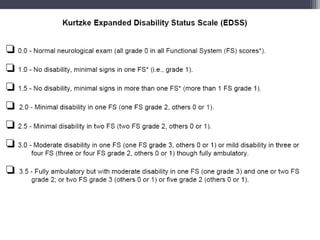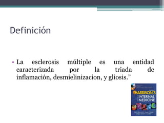 La esclerosis múltiple es una enfermedad inflamatoria desmielinizante del sistema nervioso central caracterizada por inflamación, desmielinización y gliosis. Su prevalencia varía globalmente entre 5-80 por 100,000 personas, siendo más alta en Europa y más baja en África. En México, estudios muestran una incidencia de 1.6 por 100,000 personas. Los síntomas clínicos incluyen alteraciones visuales, sensoriales, motoras y esfinterianas. El diagnóstico se basa en hallazgos clí