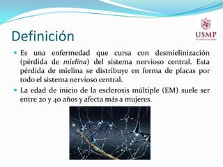 La esclerosis múltiple es una enfermedad autoinmune que causa desmielinización en el sistema nervioso central, manifestándose generalmente entre los 20 y 40 años. Aunque su causa es desconocida, parece haber una predisposición genética y la actuación de un posible factor ambiental como un virus durante la infancia. Los síntomas varían según las zonas afectadas y pueden incluir pérdida de fuerza, adormecimiento, problemas de visión y coordinación. El diagnóstico se basa en los síntomas, la resonancia magné
