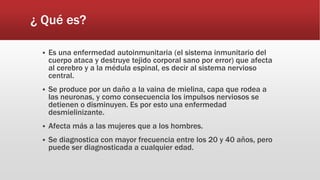 La esclerosis múltiple es una enfermedad autoinmunitaria que afecta al cerebro y la médula espinal al dañar la vaina de mielina que rodea las neuronas, impidiendo la conducción de impulsos nerviosos. Sus síntomas pueden incluir problemas de movilidad, sensibilidad, visión, equilibrio, así como síntomas intestinales, vesicales y sexuales. No tiene cura pero se trata para retrasar su progresión a través de medicamentos e intervenciones como fisioterapia y estilo de vida saludable