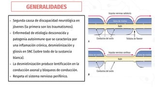 La esclerosis múltiple es la segunda causa de discapacidad neurológica en jóvenes. Se caracteriza por una inflamación crónica y desmielinización en el sistema nervioso central, causando lentificación en la conducción nerviosa. Afecta principalmente a mujeres jóvenes de raza blanca y del norte de Europa. Su diagnóstico requiere evidencia de lesiones diseminadas en el tiempo y espacio mediante resonancia magnética, y el descarte de otras enfermedades. Su tratamiento incluye corticoides para los brotes y