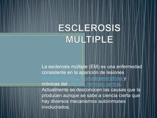 La esclerosis múltiple es una enfermedad crónica del sistema nervioso central causada por el ataque del sistema inmunitario contra la vaina de mielina de los nervios, lo que provoca lesiones desmielinizantes en el cerebro y la médula espinal. Actualmente no se conocen las causas exactas pero se cree que factores genéticos y ambientales contribuyen a la enfermedad. Los síntomas varían pero incluyen debilidad muscular, entumecimiento, visión borrosa y fatiga. Existen tratamientos que pueden ayud