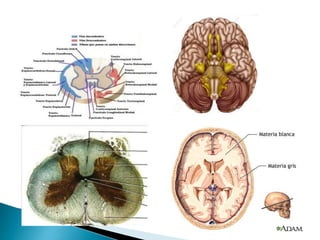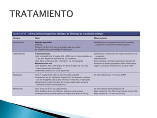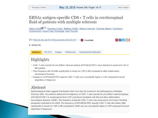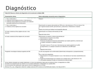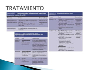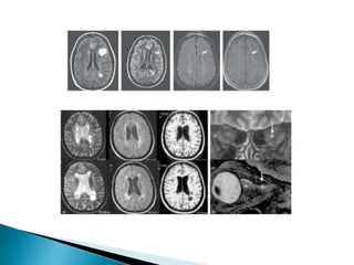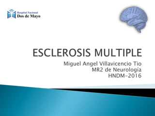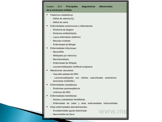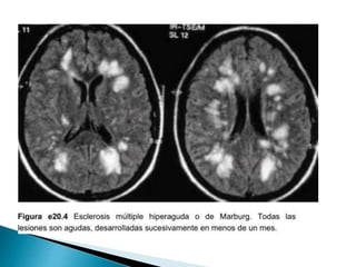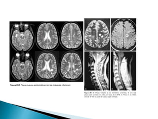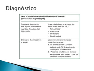 El documento describe la esclerosis múltiple (EM), una enfermedad desmielinizante del sistema nervioso central. La EM causa lesiones desmielinizantes en el cerebro y la médula espinal que conducen a la discapacidad neurológica. La EM se caracteriza por episodios recurrentes de síntomas neurológicos seguidos de períodos de remisión. La patogénesis implica una respuesta autoinmune mediada por linfocitos T contra la mielina, posiblemente desencadenada por factores genéticos y
