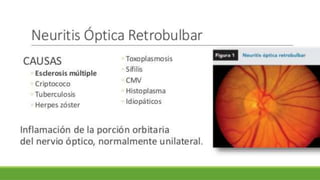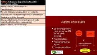 El documento resume información sobre la esclerosis múltiple (EM), incluyendo su epidemiología, factores de riesgo, manifestaciones clínicas, patología, inmunopatología, teorías de patogenia, tratamientos farmacológicos y la depresión asociada a la EM. Ofrece detalles sobre la prevalencia más alta en mujeres, su asociación con infecciones virales y factores genéticos, y describe las placas desmielinizantes como la lesión patológica característica.
