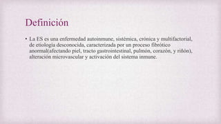 La esclerosis sistémica es una enfermedad autoinmune crónica caracterizada por fibrosis de órganos como la piel, tracto gastrointestinal y pulmones. Su etiología es desconocida pero involucra alteraciones vasculares, del colágeno y del sistema inmune. Se presenta más en mujeres y su incidencia aumenta entre las décadas 5 y 6 de vida. No tiene cura pero se trata con glucocorticoides, D-penicilamina u otros fármacos para reducir los síntomas.