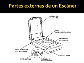 Este documento resume la historia y tipos de escáneres. Comenzó en 1984 con el primer escáner de blanco y negro de 200 ppp y desde entonces ha evolucionado para incluir escáneres a color, de mayor resolución, velocidad y tamaños variados. Explica los diferentes tipos de escáneres como de sobremesa, rodillo, mano, tambor y código de barras así como sus características clave como resolución, formato, velocidad y especificaciones.