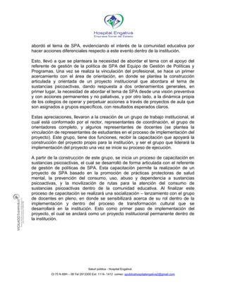 El documento describe una experiencia significativa en el Instituto Educativo Distrital Antonio Villavicencio en Engativá para construir un programa sobre sustancias psicoactivas. Se formó un grupo de trabajo institucional con el rector, coordinadores, orientadores y algunos docentes para recibir capacitación sobre sustancias psicoactivas y liderar la implementación de un proyecto permanente que aborde la prevención del consumo y promueva la salud mental. El proyecto se enfocará en la promoción de prácticas protectoras de salud mental, pre