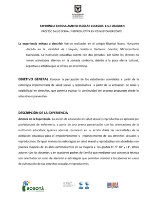 Este documento describe una experiencia exitosa de educación en salud sexual y reproductiva implementada en el colegio distrital Nuevo Horizonte en Bogotá. Profesionales de enfermería educaron a estudiantes de grados 8o a 11o sobre derechos sexuales, planificación familiar y autocuidado. Como resultado, los estudiantes mostraron mayor conciencia sobre estos temas y consultaron más servicios de salud. Los docentes reconocieron la importancia de abordar estos temas desde una perspectiva integral que incluya emociones y proyecto de