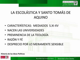 Este documento resume la vida y obras de Santo Tomás de Aquino. Explica que estudió en la abadía de Montecasino y la Universidad de Nápoles, y se unió a la orden dominica a pesar de la oposición de su familia. Sus obras más importantes fueron la Summa Theologiae y el De Regno, en las que sintetizó el pensamiento aristotélico y cristiano, y defendió que la autoridad política viene de Dios y debe buscar el bien común.