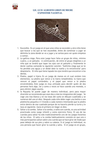 Este documento describe 19 juegos infantiles populares, incluyendo Escondite, La Gallina Ciega, Piedra Papel o Tijera, La Rayuela, Saltar a la Cuerda, Carrera de Sacos, Pelota Bota, Tres en Raya, Las Canicas, Sillas Musicales, Juego de la Soga, Polis y Cacos, La Carretilla, Un Dos Tres Pollito Inglés, Juego del Pañuelo, Juego del Trompo, Veo Veo, La Goma y Gato y Ratón.