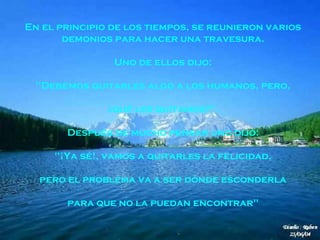 Los demonios planean esconder la felicidad de los humanos después de robarla. Proponen esconderla en la cima de una montaña, el fondo del mar, o un planeta lejano, pero todos reconocen que eventualmente los humanos podrían descubrirla. Finalmente, uno sugiere esconderla dentro de los propios humanos, de modo que estén tan ocupados buscándola fuera que nunca la encuentren dentro de sí mismos. Los demás demonios aceptan el plan.
