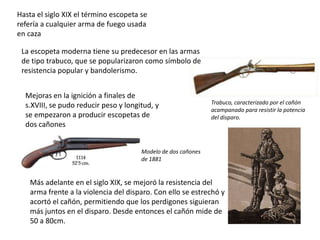 Las escopetas son armas de fuego de mano que disparan perdigones en lugar de balas. Se caracterizan por dispersar los perdigones al disparar, lo que les permite atacar varios blancos a la vez o uno solo sin necesidad de apuntar con precisión a corta distancia. A lo largo de la historia han mejorado su diseño para resistir mejor la potencia del disparo, desde trabucos hasta modelos modernos semiautomáticos o de corredera.