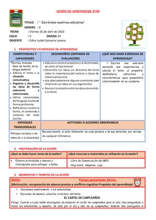 En esta sesión, los estudiantes aprendieron a escribir anécdotas siguiendo los pasos de planificación, escritura y edición. Primero, recordaron lo que es una anécdota y sus partes. Luego, escribieron el borrador de sus propias anécdotas teniendo en cuenta elementos como la estructura, la ortografía y la puntuación. Finalmente, editaron sus anécdotas para incluirlas en un cuaderno de vida del grupo. El objetivo fue que los estudiantes aprendieran a narrar sus experiencias personales de forma