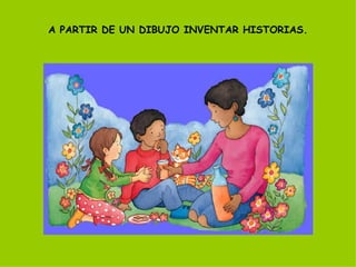 Tres grupos de estudiantes de 1er grado inventaron historias basadas en un dibujo. La primera historia describe a una familia feliz disfrutando de un día de verano comiendo sándwiches y jugo de naranja con su gato entre las flores. La segunda historia cuenta sobre una mamá y sus hijos divirtiéndose en la primavera mientras comen sándwiches y jugo de naranja con su gato alrededor de las flores. La tercera historia habla sobre dos niños y una mamá que deciden salir a comer con su g