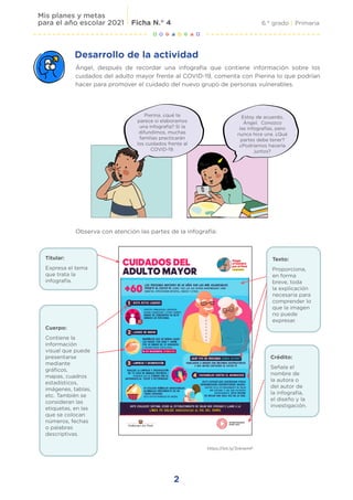 El documento proporciona instrucciones para que los estudiantes aprendan a escribir una infografía sobre los cuidados de la salud frente al COVID-19. Explica las partes de una infografía y las etapas del proceso de escritura, que incluyen planificar, producir el texto y recursos visuales, y editar el producto final. El objetivo es que los estudiantes informen a las familias sobre cómo protegerse del virus de manera concisa y entretenida.