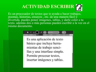 Este documento proporciona instrucciones sobre cómo usar las herramientas de procesamiento de texto de Writer para crear y editar documentos. Explica cómo aplicar formato de texto como cursiva, subrayado y color, insertar imágenes y tablas, y usar las herramientas de edición como deshacer, copiar y pegar. También describe cómo guardar y compartir los documentos terminados en diferentes formatos como RTF, HTML y TXT.