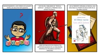 Este documento discute el concepto de novela gráfica y teatro gráfico. Explica que la novela gráfica surgió en la década de 1960 como una combinación de palabras e imágenes. También analiza dos ejemplos de teatro gráfico: "Teatro en viñetas" de Argentina y "Rabinal Achí" de Guatemala. Finalmente, analiza la portada e imágenes internas de la adaptación gráfica de "Rabinal Achí".