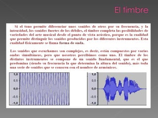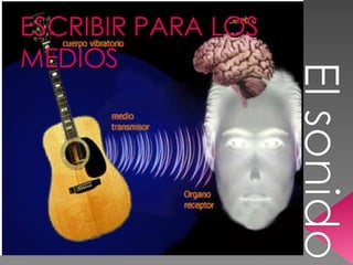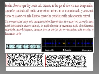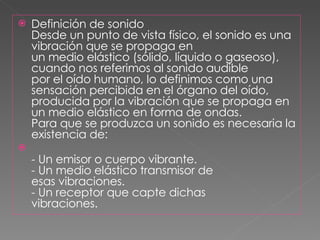 El documento define el sonido como una vibración que se propaga a través de un medio elástico y puede ser percibido por el oído humano. Explica que para que haya sonido se necesita un emisor, un medio transmisor y un receptor, y que el sonido puede tener orígenes naturales o ser producido por animales, la voz humana o dispositivos. Además, describe cómo se propagan las ondas sonoras a través de la compresión y expansión sucesiva de las partículas de un medio elástico como el a
