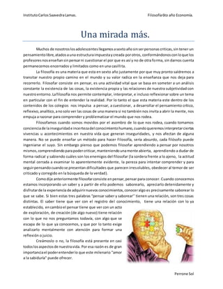 Este documento describe la importancia de la filosofía como materia escolar en sexto año. Explica que la filosofía fomenta el pensamiento crítico, reflexivo y analítico, invitándonos a cuestionar las cosas en lugar de aceptarlas pasivamente. También define la filosofía como el acto de pensar para comprender el mundo que nos rodea y resolver incertidumbres. Finalmente, enfatiza que la filosofía está presente en muchos aspectos de la vida y que es importante entender lo que este "amor a la sabidur