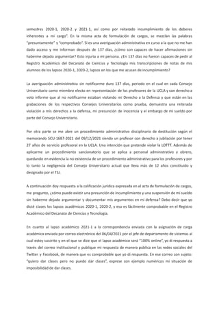 Ismael Álvaro Muñoz Peralta denuncia la suspensión de su sueldo por 137 días sin garantizar su derecho a la defensa ni notificarlo adecuadamente sobre un proceso administrativo. Alega que esta acción del consejo universitario violó sus derechos fundamentales, incluyendo la presunción de inocencia y el derecho a un sueldo digno, y cuestiona la capacidad de la universidad para justificar su incumplimiento en la carga académica. Muñoz Peralta exige explicaciones sobre cómo se le puede acusar de incumplimiento sin haber tenido la oportunidad de defenderse.
