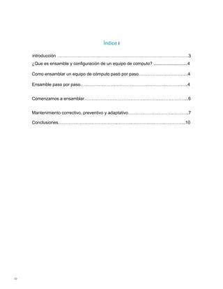 Este documento explica cómo ensamblar y configurar un equipo de cómputo de manera segura y efectiva. Detalla los pasos para ensamblar los componentes hardware, instalar el sistema operativo, y realizar mantenimiento preventivo y correctivo para garantizar el buen funcionamiento a largo plazo.