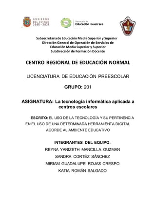 Este documento discute el uso de la tecnología en entornos educativos preescolares. Explica que las herramientas digitales pueden ser útiles para apoyar el aprendizaje de los niños siempre y cuando se utilicen de manera apropiada y con supervisión de un adulto. También destaca algunas ventajas del uso de la tecnología como la motivación para aprender y el acceso a recursos educativos, pero advierte sobre posibles desventajas como la distracción si no se controla bien su uso.
