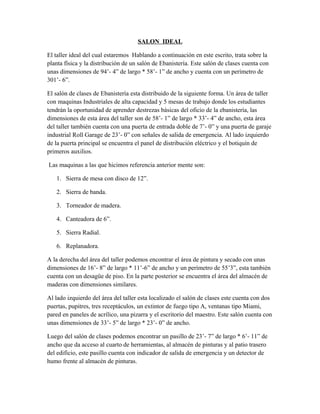 Este documento describe el diseño ideal de un salón de ebanistería. El salón tiene un área de taller con máquinas industriales y mesas de trabajo. También incluye un salón de clases, un cuarto para herramientas y pintura, un salón de dibujo y computadoras, y baños adaptados para personas con discapacidad. El diseño busca proporcionar a los estudiantes un espacio funcional y accesible para aprender el oficio de la ebanistería.