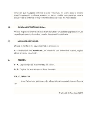 La madre de una menor de 13 años solicita al juez una medida cautelar de asignación anticipada de alimentos de S/ 800 mensuales contra el padre de la menor. Alega que el padre se niega a asumir su responsabilidad de proveer alimentos a pesar de tener los medios para hacerlo como maestro de construcción con ingresos superiores a S/ 3,000 mensuales. Solicita la medida cautelar de manera urgente dado que se encuentra en una precaria situación económica y el proceso principal podría demorar, poni