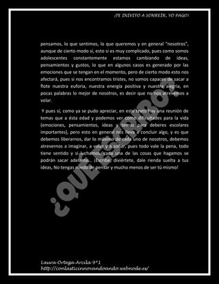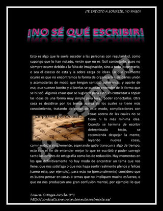 Este documento habla sobre las dificultades de organizar y dar coherencia a las ideas cuando se escribe. Sugiere comenzar copiando ideas de forma simple y luego conectarlas, y escribir sobre temas que se conozcan bien para evitar complicaciones. También recomienda tomarse tiempo después de escribir para revisar y corregir errores con perspectiva. Finalmente, concluye que los adolescentes deben atreverse a imaginar, soñar y dar lo mejor de sí mismos al escribir, sin temor a expresar sus ideas.