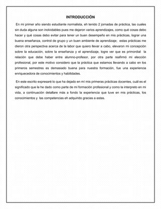 Este documento presenta la reflexión de una estudiante normalista sobre sus primeras prácticas docentes en un jardín de niños. La autora describe sus experiencias observando a la maestra, realizando diagnósticos de los niños, y planeando e implementando actividades. Aunque tuvo algunas dificultades, aprendió sobre la importancia de la confianza en sí misma y de adaptar las lecciones a los niños. Concluye que las prácticas docentes enriquecen su formación al aprender tanto de los éxitos como de los errores.