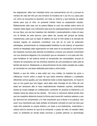 La maestra se enfoca en enseñar valores como el respeto y la honestidad a los estudiantes de primer grado para ayudarlos a formarse éticamente y evitar que se unan a pandillas. Los niños cuyos padres muestran más interés en su educación generalmente tienen un mejor rendimiento. La maestra y otras maestras visitaron la casa de un estudiante que faltaba a clases frecuentemente para entender mejor su situación familiar y cómo podían motivarlo a asistir a la escuela regularmente. La maestra también enseña a