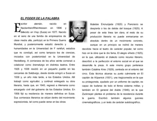 Carl Zuckmayer fue un dramaturgo alemán nacido en 1896 que escribió obras expresionistas en sus comienzos. Más tarde se dedicó al teatro popular, donde destacó su obra El alegre viñedo de 1925. También escribió El capitán de Köpenick en 1931 y El general del diablo en 1946, donde abordó temas como la resistencia alemana durante la guerra. Vivió en varios países debido al ascenso del nazismo.