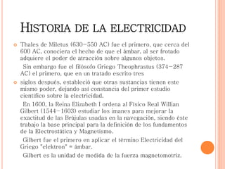 Este documento resume brevemente la historia de la electricidad desde la Antigua Grecia hasta el siglo XX. Menciona que Thales de Miletus fue el primero en observar la electricidad estática en el ámbar en el 600 a.C., mientras que Theophrastus estableció el primer estudio científico sobre el tema tres siglos después. Luego describe algunos inventos e inventores clave en el desarrollo de la electricidad y la tecnología eléctrica a través de los siglos.