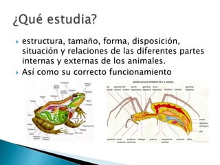 Este documento describe las principales estructuras anatómicas de los animales, incluyendo los músculos, el corazón, los huesos y la piel. Explica que los músculos esqueléticos están conectados a los huesos a través de tendones y están envueltos en tejido. También describe que el corazón es un músculo hueco responsable de bombear la sangre, y que los músculos lisos conforman los órganos y arterias. Finalmente, resume que la piel es el órgano más