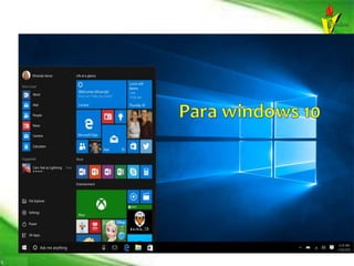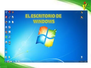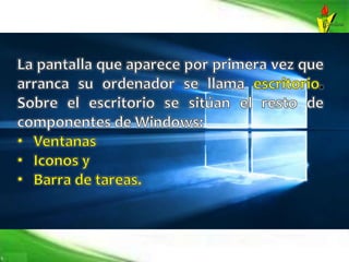 El documento proporciona información sobre Windows, incluyendo que es el sistema operativo más popular desarrollado por Microsoft, fue introducido en 1985, y su creador fue Bill Gates. Explica los principales elementos de la interfaz gráfica como el escritorio, iconos, ventanas y barras. También describe cómo crear, guardar, abrir y eliminar documentos y carpetas.