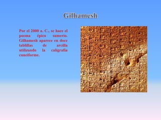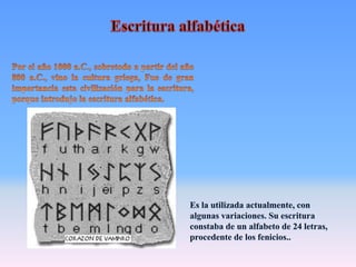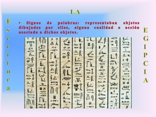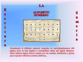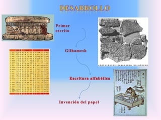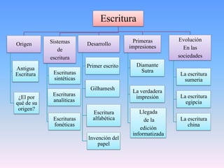 La escritura tuvo orígenes diversos en diferentes culturas antiguas como una forma de registrar información de manera más eficiente. La escritura sumeria surgió alrededor del 3000 a.C. para llevar registros contables y administrativos, mientras que la escritura egipcia se usó para documentos diplomáticos y religiosos. La escritura china se originó a partir de los rituales adivinatorios de la dinastía Shang aproximadamente en el 1700 a.C., representando los 8 trigramas como base del sistema. Cada cultura des