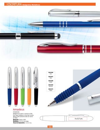 Este documento contiene información sobre varios modelos de bolígrafos metálicos y plásticos, incluyendo sus códigos, colores disponibles, medidas, materiales y áreas de impresión. Se proporcionan detalles para bolígrafos de cobre, aluminio, acero y plástico de diferentes marcas como Amadeus, Brahms, Latina y Aspen.