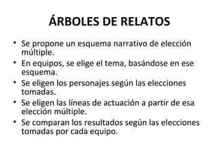 Este documento presenta varios ejemplos de actividades creativas para practicar la expresión escrita en clase de lengua extranjera. Algunas de las actividades propuestas incluyen: árboles de relatos donde los estudiantes crean historias de forma colaborativa; binomios fantásticos donde asocian conceptos dispares para generar ideas para cuentos; y explorar hipótesis imaginativas llevando situaciones improbables a sus últimas consecuencias narrativas. El objetivo es fomentar la creatividad y la práct
