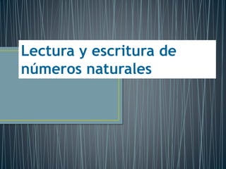El documento explica cómo leer y escribir números naturales. Primero, se leen los números de izquierda a derecha. Además, es más fácil aprender los números del 1 al 10 y luego de 10 en 10. Finalmente, detalla cómo se escriben los números en palabras, ya sea con una palabra para las centenas y números del 11 al 19 y 21 al 29, o con tres palabras para los números del 31 al 99.