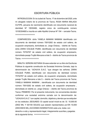 1. Doña Yanela Mamani Mamani y doña Zarai Colque Puma constituyen la sociedad anónima cerrada denominada "Uchuva S.A.C." ante la notaria Rosa María Malaga Cutipe.
