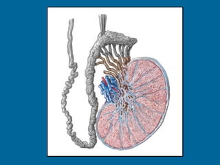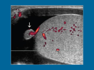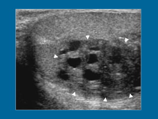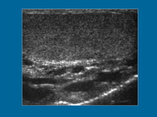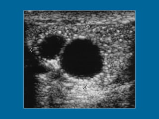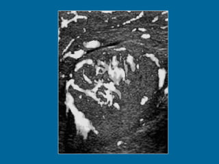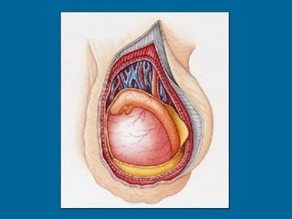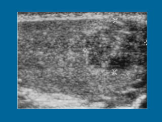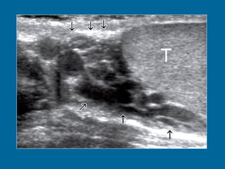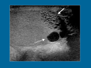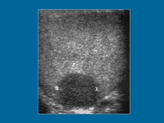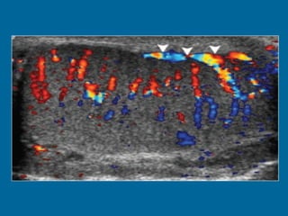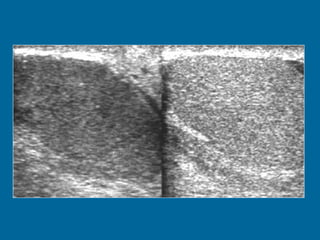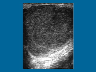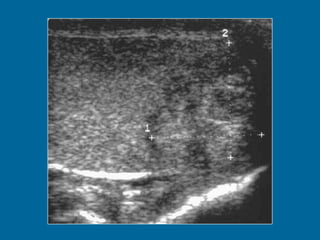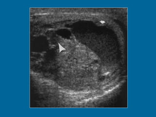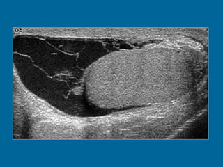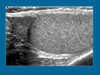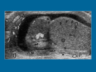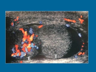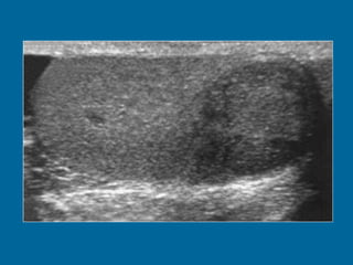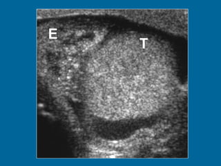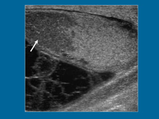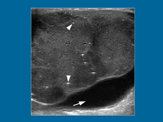 El documento describe la anatomía normal y patológica del escroto y sus contenidos a través de ecografía. Incluye descripciones detalladas de tumores testiculares como el seminoma y carcinoma embrionario, así como patología benigna como quistes, ectasia de rete testis e hidrocele. Explica las características ecográficas que ayudan al diagnóstico diferencial entre lesiones malignas y benignas.