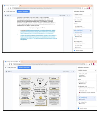 Este documento presenta los conceptos básicos de programación como constantes, variables, acumuladores, contadores e identificadores. Explica estos conceptos y cómo se usan en Pseint, una herramienta educativa para la programación. El documento concluye que estos fundamentos son esenciales para comprender y crear aplicaciones modernas y que Pseint es una valiosa herramienta accesible para aprender programación.