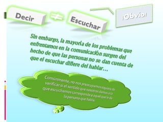 Escuchar activamente es más importante que simplemente oír, y requiere comprender al otro en lugar de solo transmitir información. Hay dos tipos de comprensión: descriptiva, que implica repetir lo dicho, y generativa, que involucra interpretar el significado subyacente. Un buen comunicador escucha con intención de entender la perspectiva del otro.